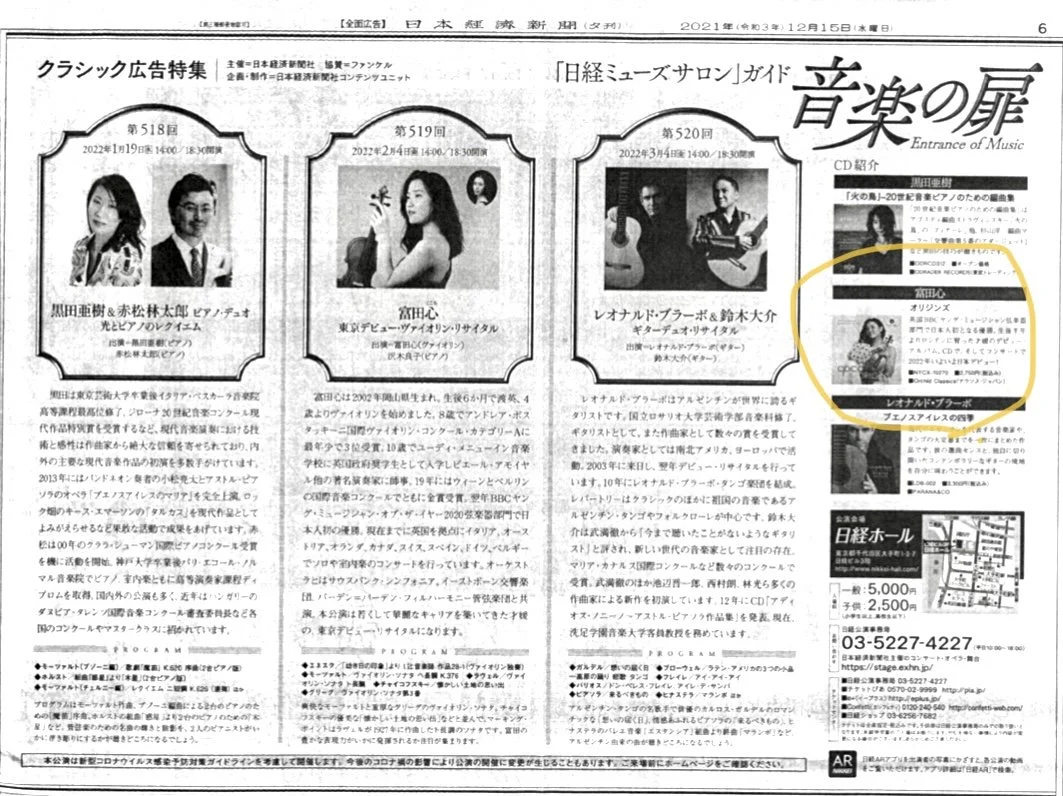 12月15日付の日経新聞東京版夕刊に、長女でヴァイオリニストの富田心の記事が