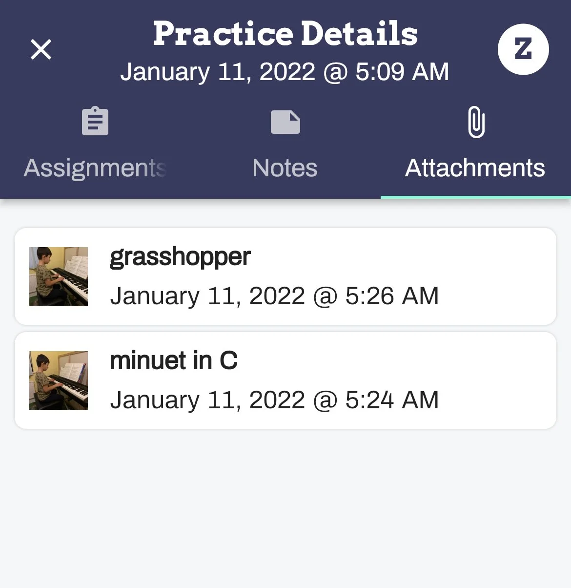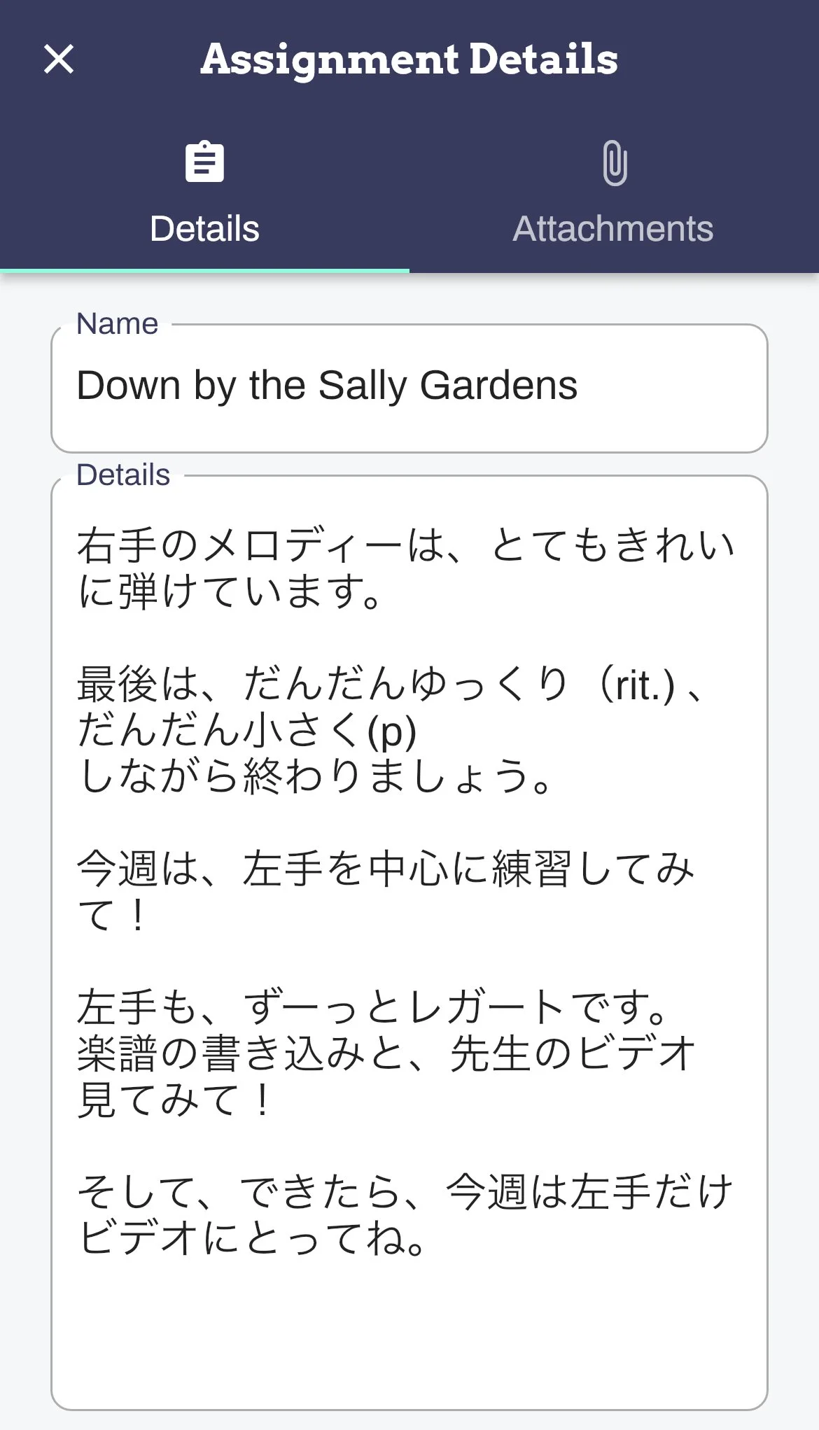 それぞれの課題について、楽譜や私からの弾き方や練習の仕方のビデオもつけられます。